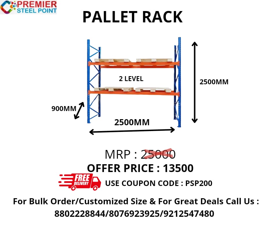PALLET RACK WITH 2 LEVELS, SIZE 900MM x 2500MM x 2500MM (POWDER COATED)