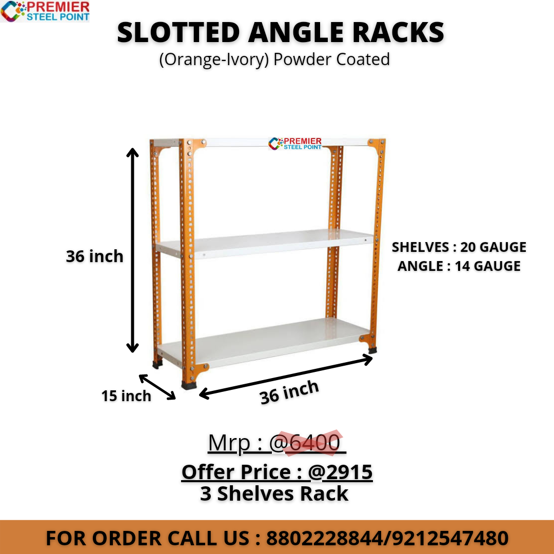 Slotted Angle Rack Orange-Ivory size 15″x36″x36″ (Powder Coating) having 3 shelves